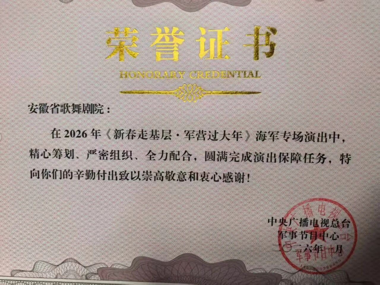 在海军安徽舰,我院和省黄梅戏剧院优秀演员参加了2026年《新春走基层·军营过大年》海军专场演出活动,为坚守岗位的官兵送上满载家乡温情的文化盛宴。演出现场军民同乐、暖意融融,我院精心编排的舞蹈《双拥花鼓情》,将国家级非遗花鼓灯的灵动与拥军深情融为一体,生动诠释了“军爱民、民拥军”的鱼水深情。